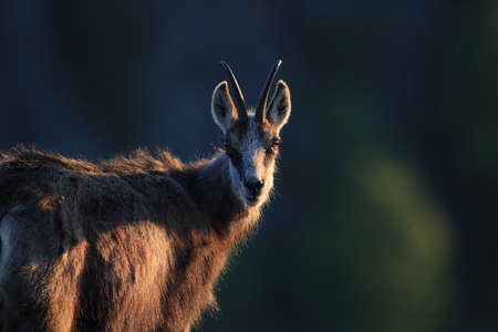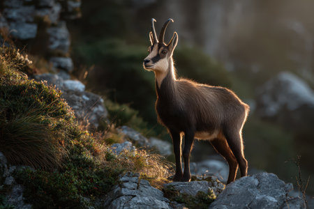 Chamois standing gracefully on rocky terrain illuminated by warm evening sunlight in a serene natural setting