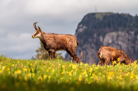 Chamois standing on the meadow in spring. Two rupicapra rupicapra in Switzerland.
