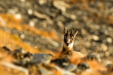 Chamois, Rupicapra rupicapra, on the rocky hill with autumn grass, mountain in Gran Paradiso, Italy. Autumn in the mountains. Mammal, herbivorous, wildlife scene