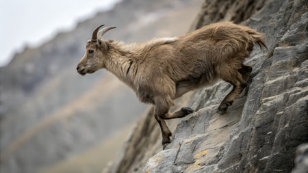 A tahr goat skillfully climbs a steep cliff, showing its agility and strength in a dramatic landscape. The rocky terrain highlights its natural habitat and adventurous spirit.