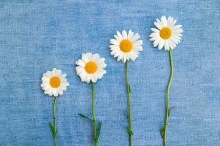 Flat lay spring and summer white chamomile flowers with green stems on blue background from top view. Floral pattern