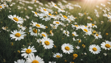 A close-up view presents numerous daisies with white petals and yellow centers. The composition displays soft lighting and a blurred background, suggesting an outdoor environment. This image could be used for various commercial purposes, including website design or print materials. The overall aesthetic suggests natural beauty and tranquility.