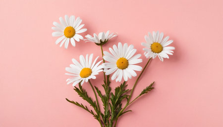 A beautiful bouquet of meadow chamomile on a gray-pink background. Top view and close up image