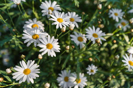 white chamomile flowers on a blurred natural background in the early morning