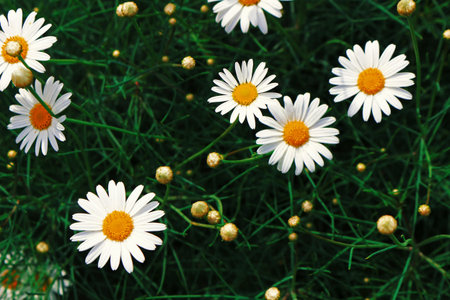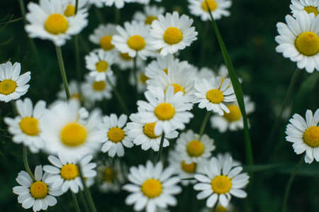 Top view of bright chamomile flowers growing on the field