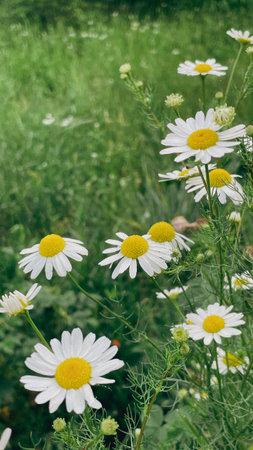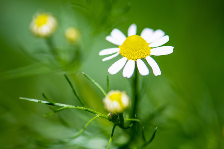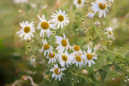wild chamomile, Matricaria chamomilla summer flowers closeup selective focus