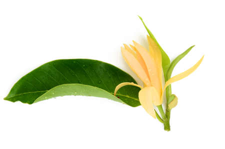 Ylang Ylang or Ilang ilang (Cananga odorata) with green leaves isolated on white background. yellow aroma flower. Fragrance flower for extract aromatherapy essential oil.