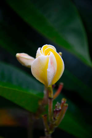 Flowers are blooming In the breeding season Has a green foliage background.white and yellow Plumeria