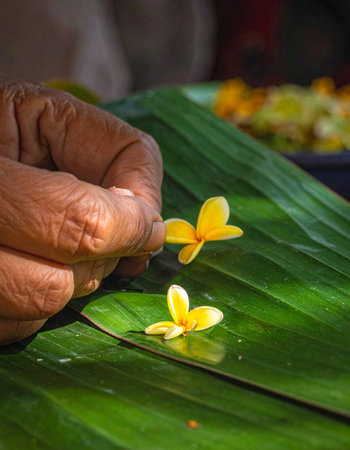 With gentle, practiced hands, an elder carefully arranges vibrant frangipani flowers on a fresh banana leaf.