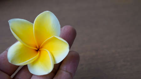 Close up hand holding yellow frangipani flower
