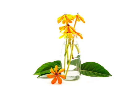 aroma oil in glass bottles and fresh flowers yellow with leaf on isolated white background.
