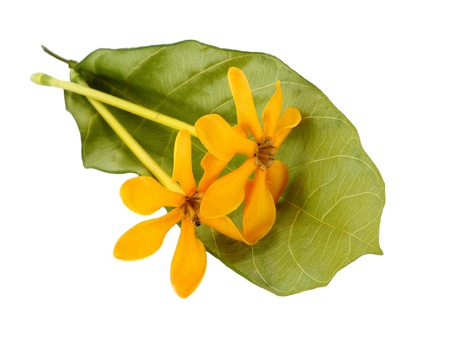 Two yellow colored plucked flowers with leaves on surface with white background. These flowers are called as Michelia champaca also known as sonchampa which are very fragrant flowers used in perfumes.