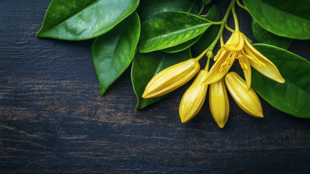 A beautiful arrangement featuring yellow blossoms and green leaves on a dark wooden background. A serene and vibrant composition that showcases nature's elegance.