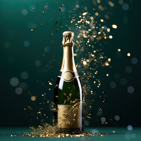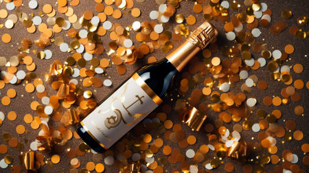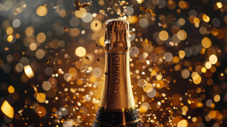 Champagne bottle with golden confetti on bokeh background.
