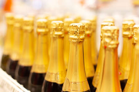 Lots of champagne bottles in store. Sale of alcoholic beverages before the holiday. Close up of bottlenecks.
