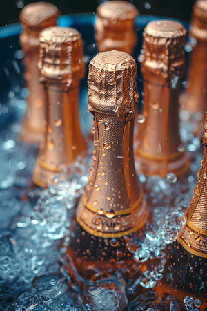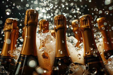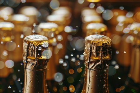 Golden champagne bottles glisten with droplets, capturing the essence of celebration in a festive atmosphere filled with soft, ambient lighting during a joyful gathering.