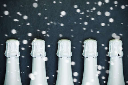Christmas concept. White Sparkling wine bottles and snow on black background