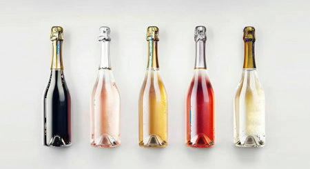 Five bottles of sparkling wine in various colors and sizes stand upright against a plain white background.
