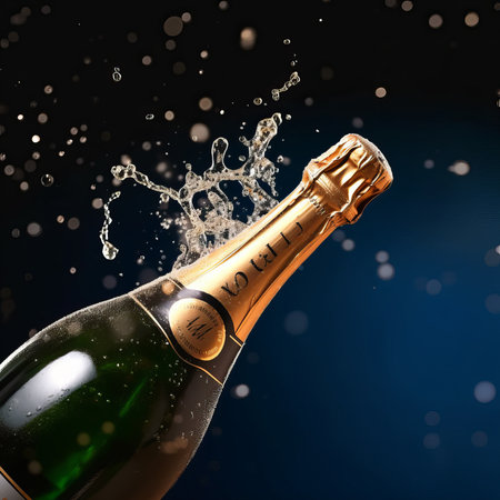 A stunning champagne bottle bursts open, releasing bubbles in a joyful celebration setting illuminated by soft twinkling lights, creating a perfect atmosphere for any festive gathering.