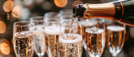 A luxurious moment as champagne is poured into elegant glasses, lined up for a toast at a festive event, exuding celebration and sophistication.