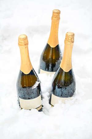 Three bottles of champagne in the snow. Winter holiday background