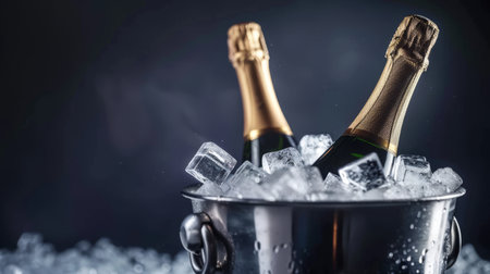 Two champagne bottles in a bucket with ice, ready for celebration.