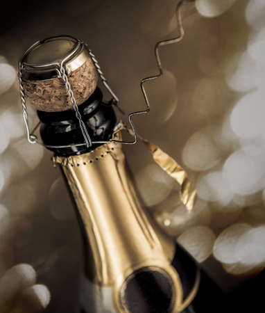 Close-up from nearly opened sparkling wine bottle with sparks on the background.
