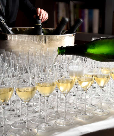 Welcome drink sommelier pours wine white sparkling wine a bottle into a glasses in the foreground. Wine tasting