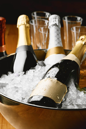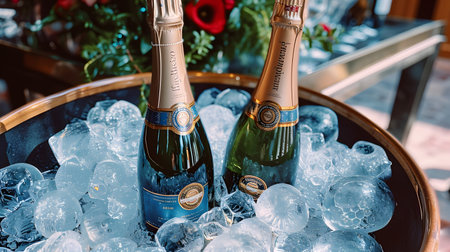 Champagne bottles in ice. Winemaking concept, copy space.