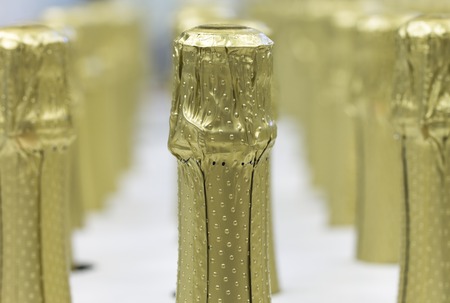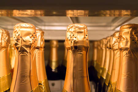 Sparkling wine bottles in golden foil for celebration. Champagne in wine store, alcohol industry
