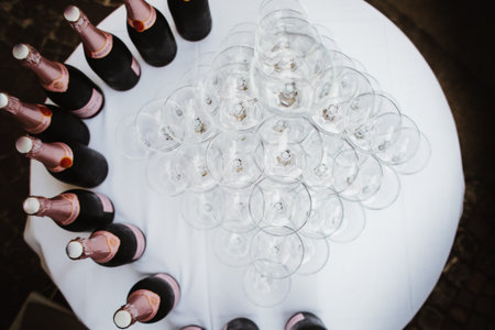 champagne glasses pyramid on a table