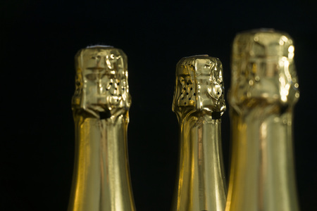 Bottle necks of Champagne bottles on black background, selective focus