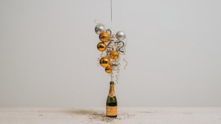 A champagne bottle stands ready for celebration, adorned with a cascade of golden and silver baubles, symbolizing joy and festivity.
