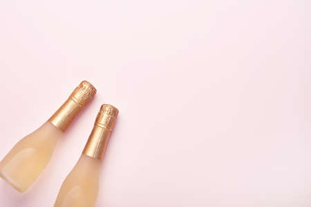 Composition with mini champagne bottles and glitter on white background, copy space