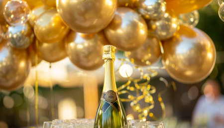 Bottle of champagne and golden balloons on a background of bokeh
