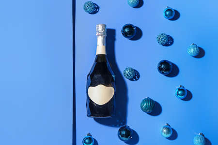 Cocktail glass with Christmas balls toys and bottle of champagne on blue mint background. Minimal christmas party concept