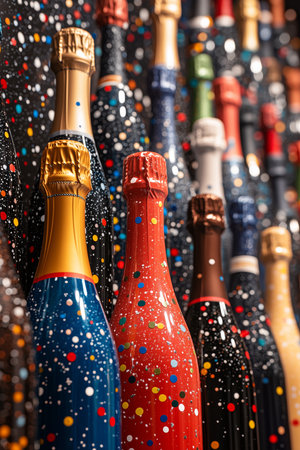 This image showcases a collection of champagne bottles in various colors, adorned with a joyful polka dot design. The festive atmosphere is enhanced by the lively arrangement.