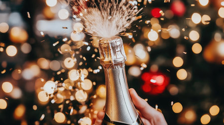 A sparkling moment captured as a champagne bottle pops open, releasing bubbles and excitement in a warm, festive atmosphere filled with colorful shimmering lights.
