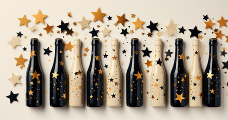 champagne bottle, stars and champagne flutes on beige background,