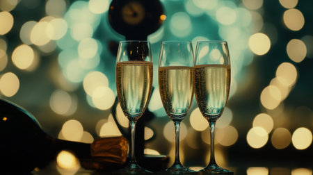 Three elegant champagne glasses filled with sparkling liquid shimmer against a beautiful bokeh backdrop, creating a festive atmosphere ideal for celebrations and special moments.