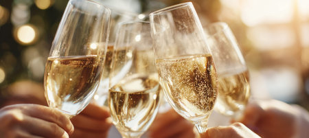 Hands clink champagne glasses filled with sparkling wine, set against a blurred festive background, suggesting a celebration or gathering atmosphere