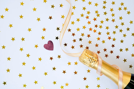 A bottle of sparkling champagne is tied with a pink ribbon, surrounded by golden stars and a red heart symbol, setting a cheerful mood for a festive gathering or celebration.