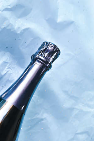 Dark elegant bottle of champagne on sky blue background. Festive minimal concept.
