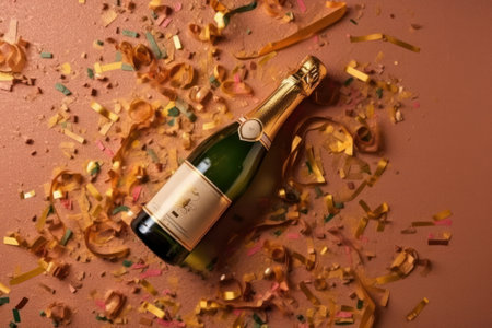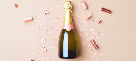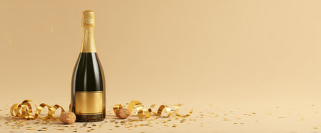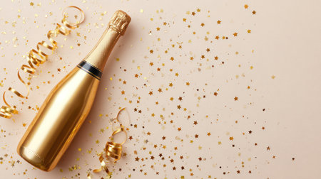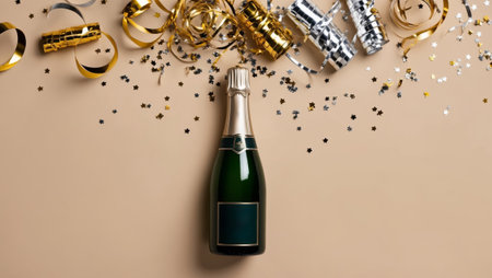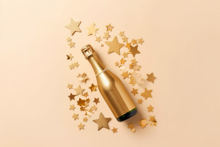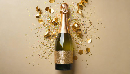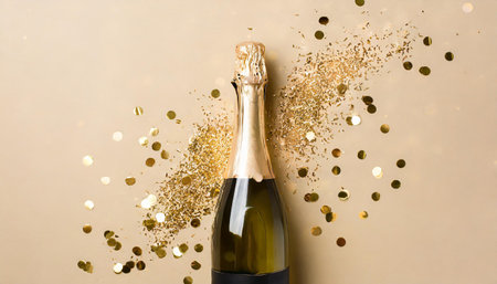 Elegant champagne bottle surrounded by golden confetti on a beige background, symbolizing festive celebration and luxury style.