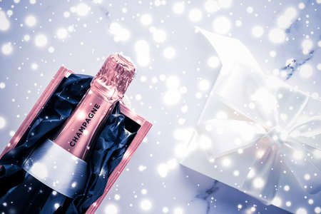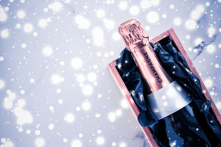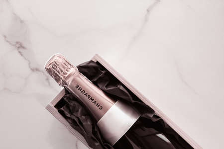 Celebration, drink and branding concept - Champagne bottle and gift box on marble, New Years, Christmas, Valentines Day or wedding holiday present and luxury product packaging for beverage brand