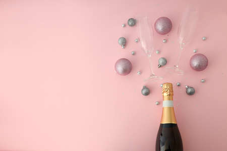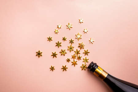 Champagne bottle with golden glittering splashes on pink background. Flat lay, top view, trendy christmas concept.