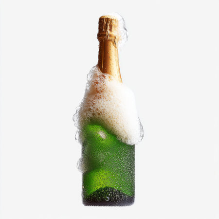 Captivating image of a green champagne bottle with elegant gold foil neck, overflowing with frothy bubbles, perfect for celebrations and events.