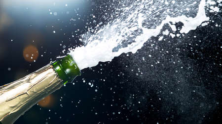 Explosion of splashing sparkling wine with flying cork out of champagne bottle on a black background