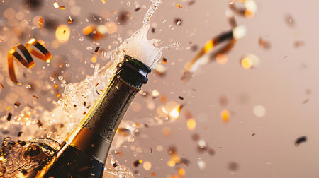 Luxurious champagne bottle explodes with bubbles, pouring sparkling wine in a splash. The golden cork flies off, symbolizing success and fun. Perfect for celebrations