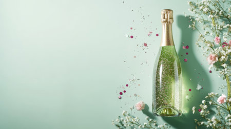 Sparkling Celebration Champagne Bottle, Glitter, Confetti, and Flowers on Green Background